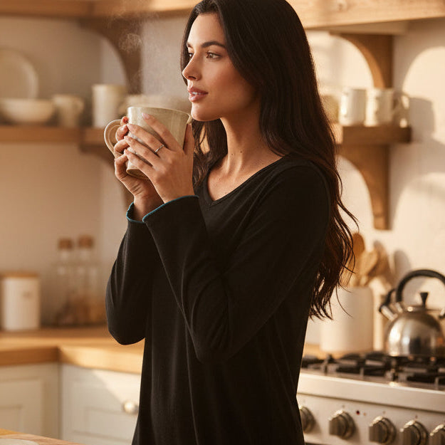 Designed with long sleeves with cuff and a flattering curved hemline, this night dress features a pop of color with contrast overlock stitching for a stylish edge. Whether you're lounging by the fire or tucking in for a peaceful sleep, this night dress is the ultimate in luxury sleepwear that performs.
