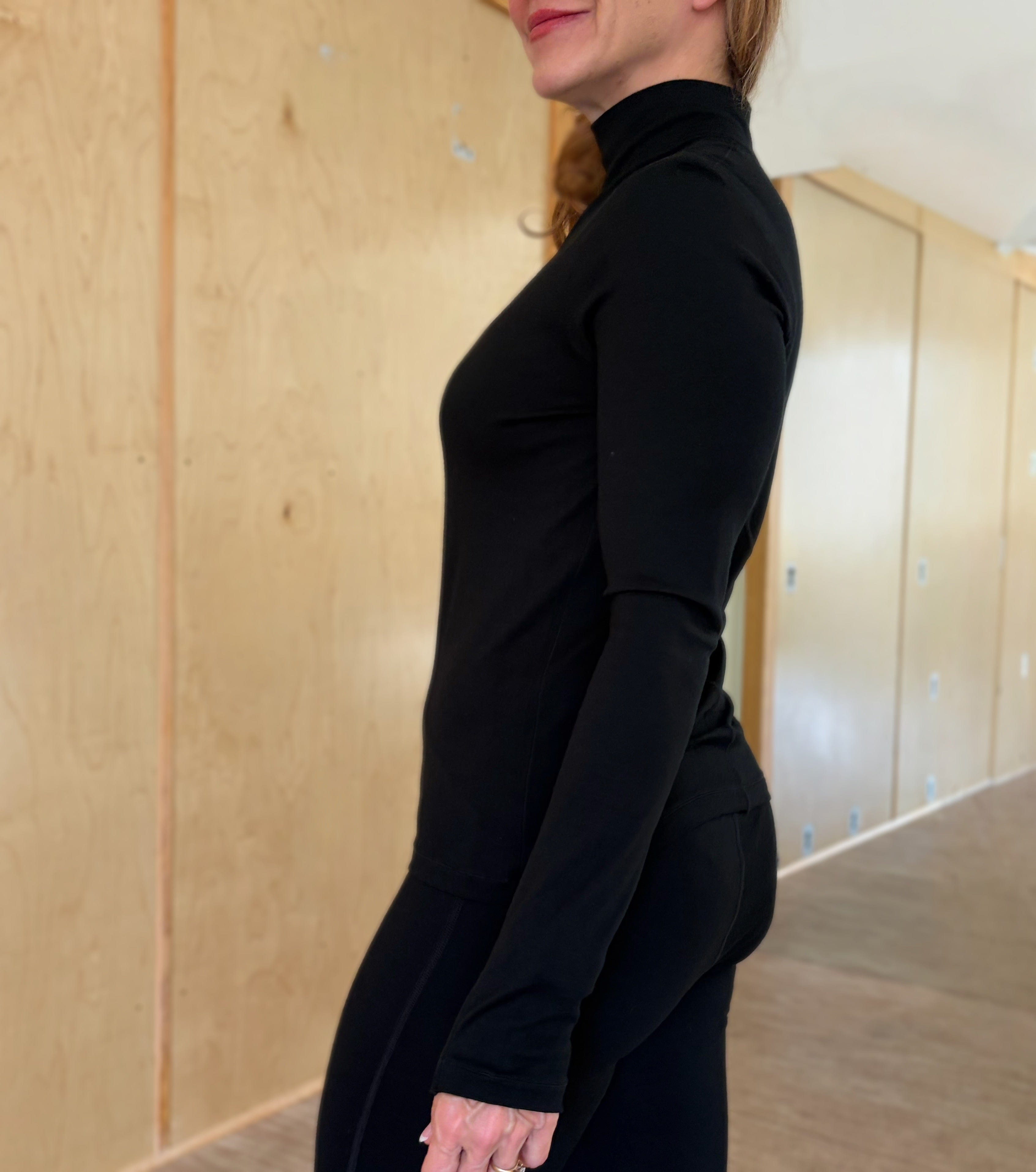 Design Details: Elegant silhouette, stitching detail, mock neckline, long sleeves with thumbholes.